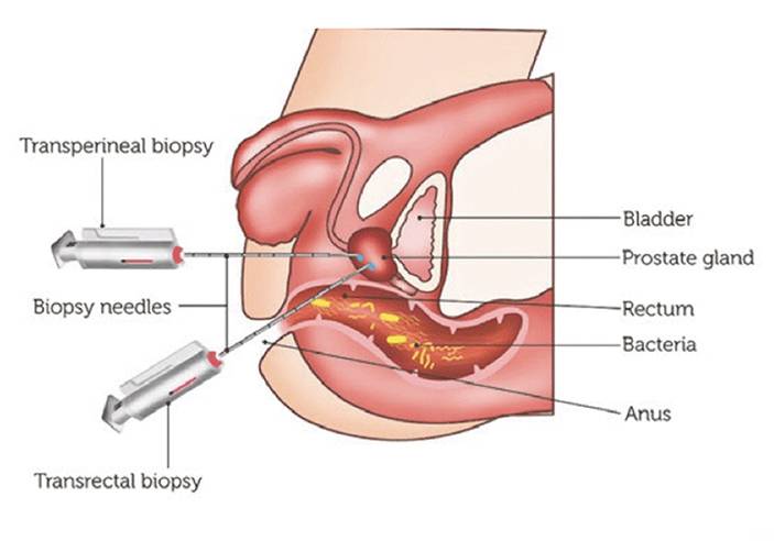 The needle is inserted through the area of skin between the anus and scrotum. A small cut is made in the area of skin (perineum) between the anus and the scrotum. The biopsy needle is inserted through the cut and into the prostate to draw out a sample of tissue. This new method offers minimal risk and discomfort as compared to the traditional transrectal method.